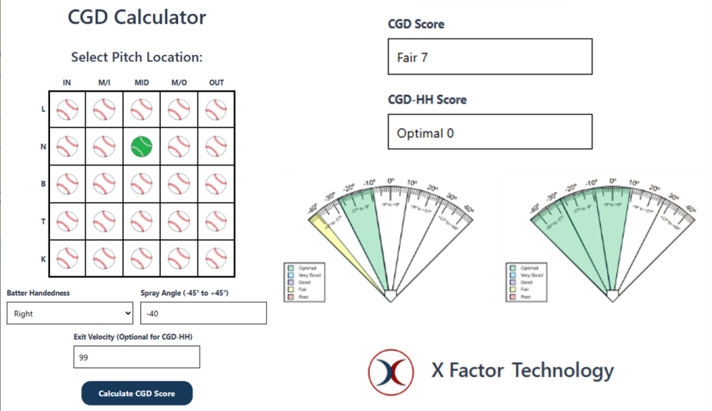 This calculator evaluates a batted ball at the collision level by measuring how closely the contact event matched the expected geometric solution for that pitch location. It scores deviation in the variables that matter at intercept, contact depth, barrel orientation, and directional commensurability, rather than relying only on downstream outcomes such as launch angle or result. Also included is a power adjusted (CGD-HH) calculation. The calculator is grounded in causal geometry, not descriptive output. It does not judge mechanics or swing style. It measures how cleanly the hitter solved the collision problem, providing an objective reference for comparing contact quality across batted balls.