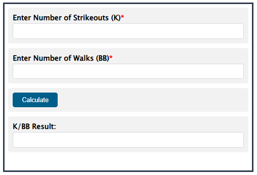 This calculator measures the relationship between a hitter’s strikeouts and walks by converting those totals into a simple strikeout-to-walk ratio. It provides a clean reference for evaluating plate outcome tendencies, showing how often a batter strikes out relative to how often they earn a walk. The calculator does not interpret approach, discipline, or offensive value on its own. It isolates the raw relationship between the two events and expresses it in a form that is easy to compare across players, seasons, or sample sets.