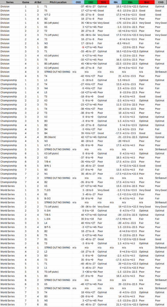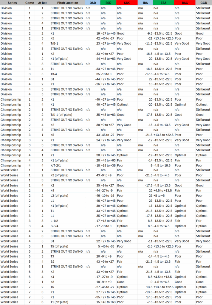 Applied to the 2025 postseason, Ohtani’s home run rate per at-bat confirms that he was dangerous when he solved the collision problem, but CGD+ shows that this occurred less frequently than outcome reputation alone would imply. His substantially higher strikeout rate, combined with elevated walk totals driven by systematic avoidance, materially reduced his total swing and collision opportunities. As a result, pitching strategies that treated all Ohtani plate appearances as equally dangerous overstated his per-appearance collision risk. Guerrero Jr.’s elevated BABIP and batting average, by contrast, exceeded what would be expected from collision geometry alone, indicating outcome amplification beyond execution quality.
