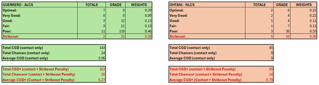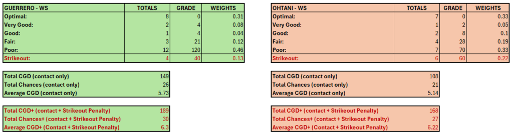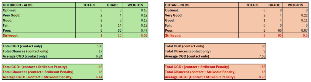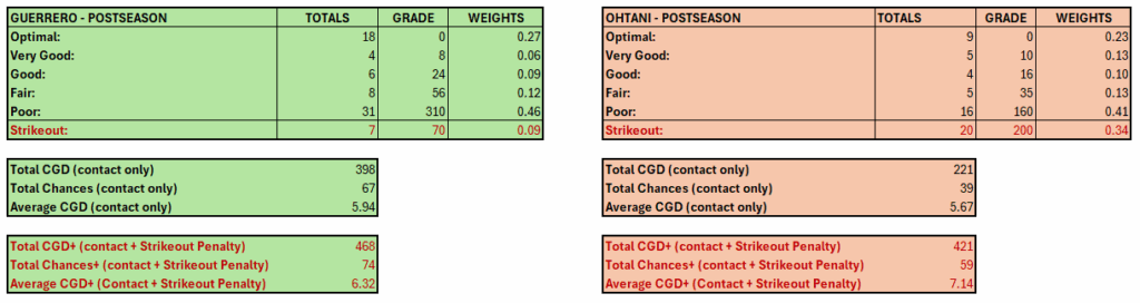 We analyzed three postseason series for Vladimir Guerrero Jr. and Shohei Ohtani in which swing events were recorded. Collision events were defined as balls put into play, including outs and sacrifice flies, while hit-by-pitch events were treated as non-swing outcomes and excluded. CGD was computed only for collision events, with strikeouts tracked separately and incorporated only in CGD+ as penalized non-collision outcomes.