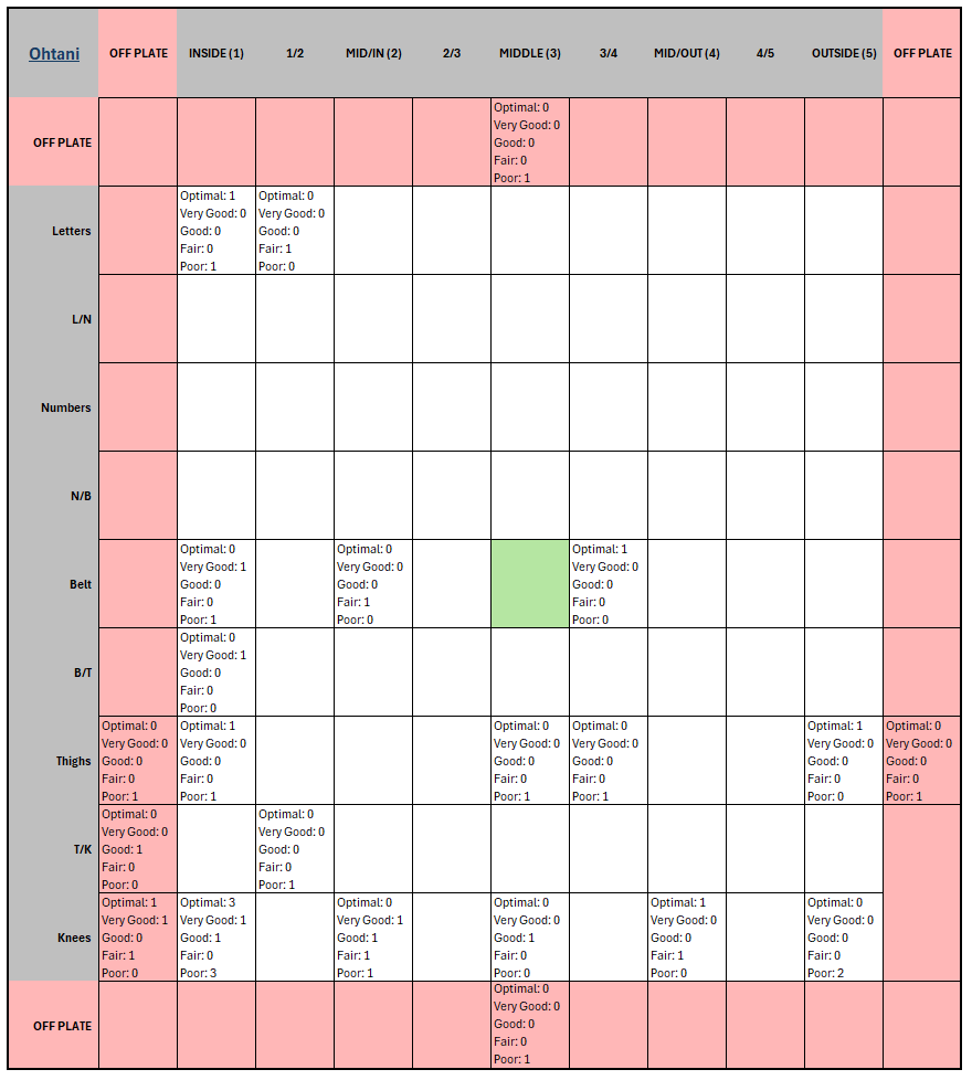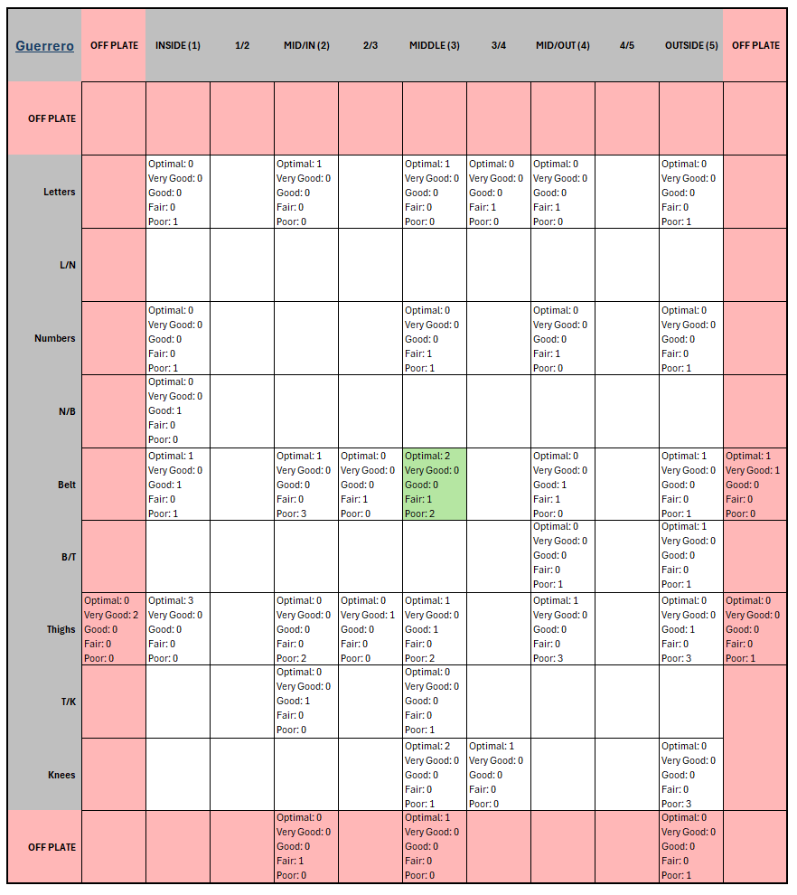 Guerrero: The buckets show that Guerrero’s collision execution is strongest on the inner third at mid-to-lower heights and remains dangerous on elevated outer-belt pitches. Optimal and Very Good outcomes concentrate at T1, B1–B3, and K3, with an additional pocket of success at B5 (2 Optimal, 1 Very Good). Poor outcomes dominate low-away (K5, T5) and extend into adjacent outer-lane zones, where Optimal buckets disappear.