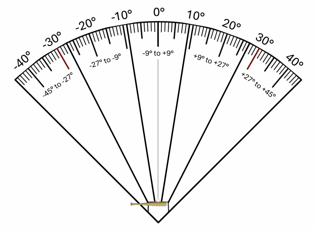 This figure illustrates the spray-direction reference framework used to operationalize the Spatial Swing Map at contact. Centered at home plate, the field is divided into uniform 18° angular intervals spanning −45° to +45°, including a central corridor (−9° to +9°) and symmetrically spaced lateral ranges. These intervals represent the allowable spray-direction bands defined by the map for evaluating contact outcomes.