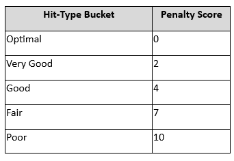 Expected collision depth and barrel orientation were defined using a precomputed Spatial Swing Map, which specifies the allowable spray-direction and reflected barrel-angle ranges for each of the 25 pitch locations, separated by hitter handedness. For a given pitch location, the map defines the expected collision depth along the swing arc and the corresponding barrel orientation required to produce the commensurate spray direction. These expected values serve as the geometric reference against which observed contact parameters are evaluated when computing CGD.