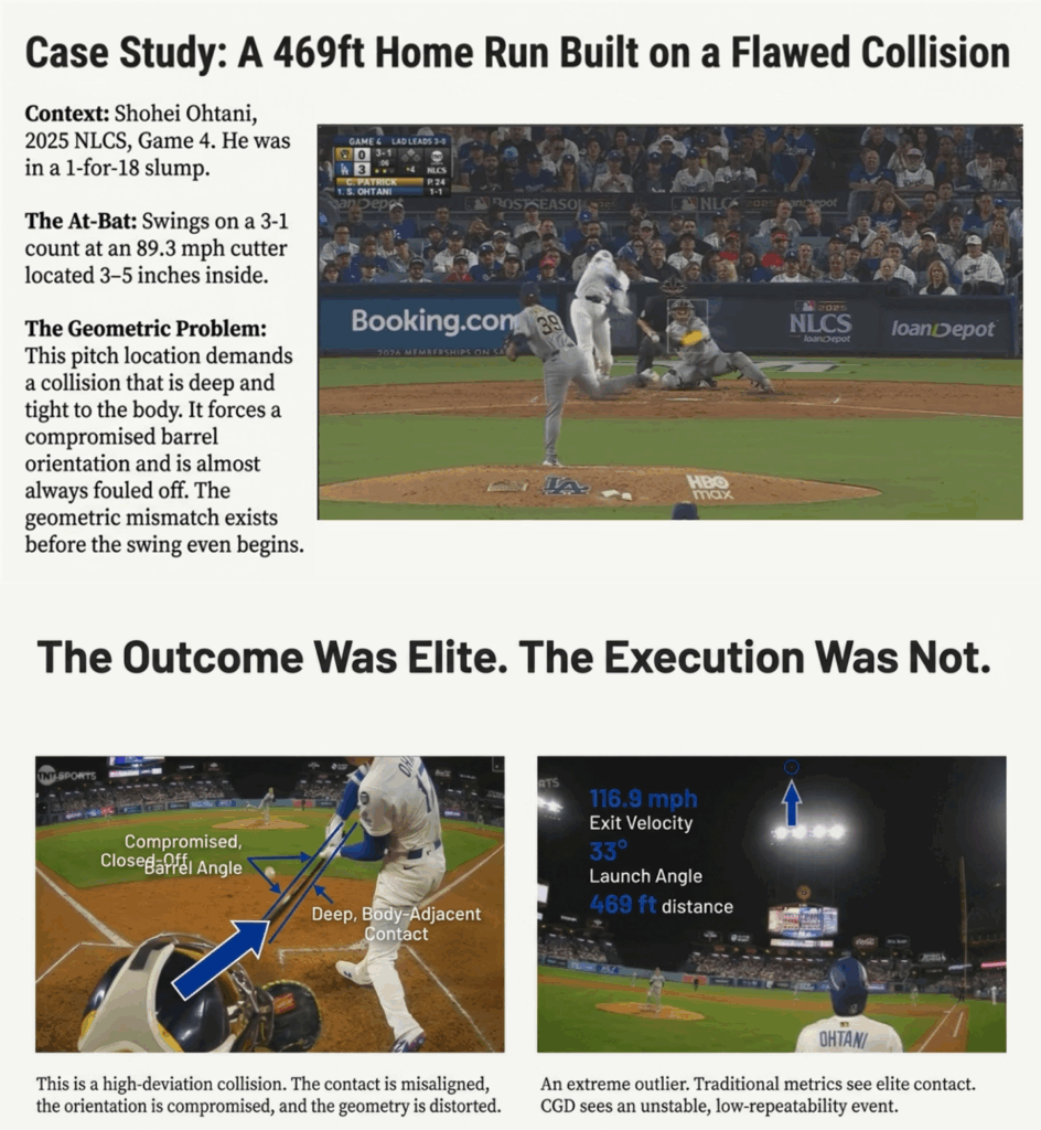 This study shows that collision execution quality and execution reliability must be evaluated separately to understand offensive risk. Collision-only CGD indicates that Shohei Ohtani and Vladimir Guerrero Jr. solved the geometric collision problem at comparable levels when contact occurred. However, CGD+ reveals a critical divergence in reliability: Ohtani’s substantially higher strikeout rate materially reduced the frequency with which those optimal collision states were reached.