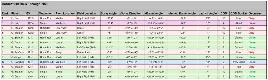 We can look at the hardest-hit balls in the Statcast era to separate exit velocity from collision geometry.